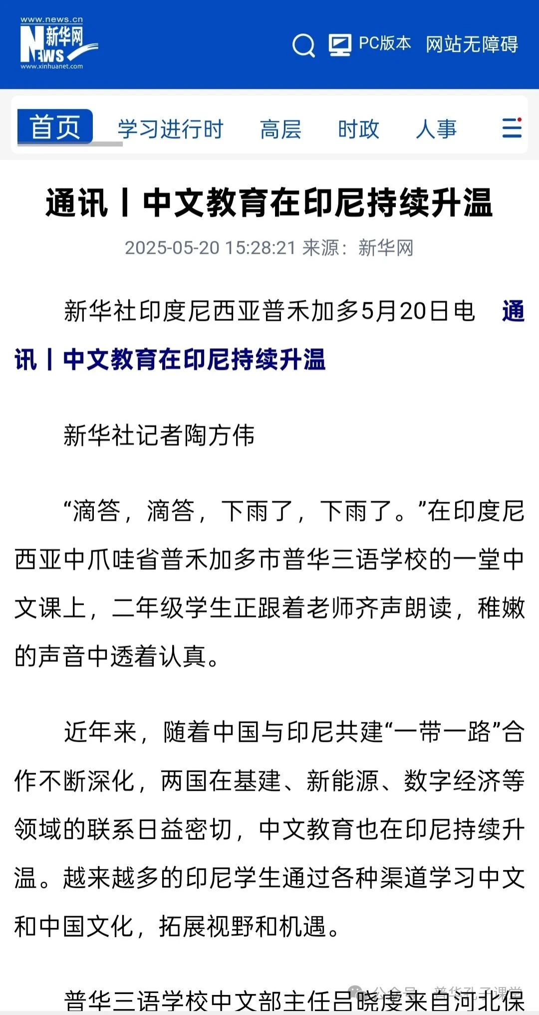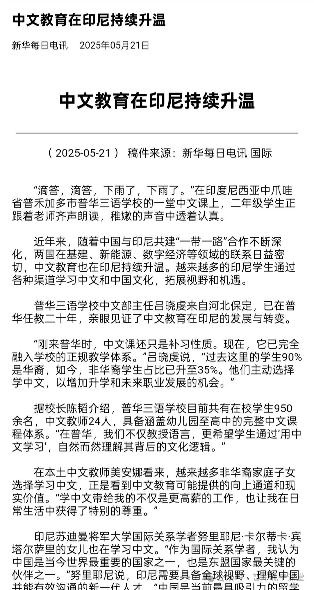 5月16日新华社驻雅加达分社记者采访普华三语学校和普华三语学校孔子课堂,并对普华三语学校总校长、普华三语学校孔子课堂负责人、普华三语学校教师、学生和家长进行了专访。